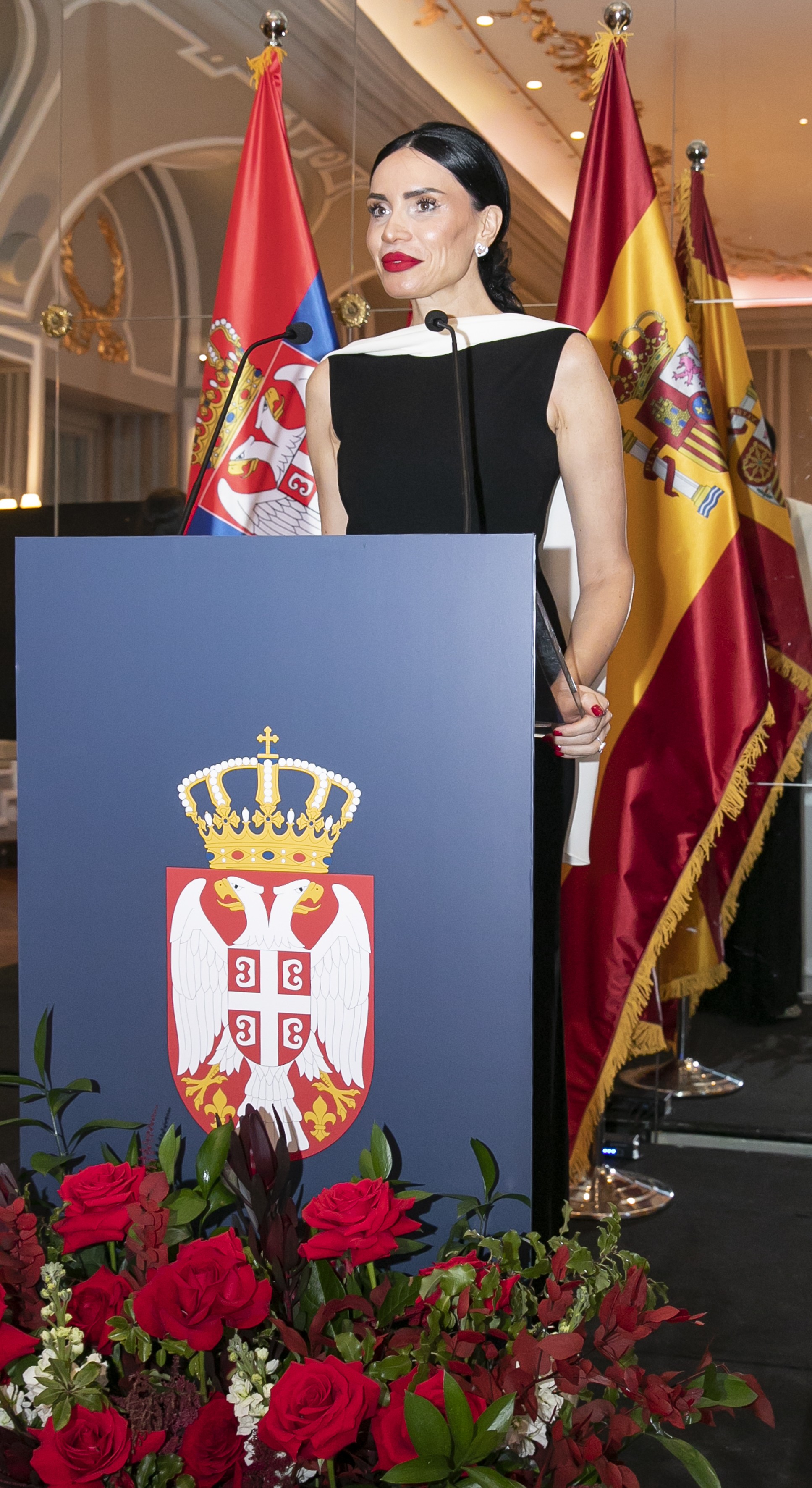 Свечаност је започета интонирањем химни Србије и Шпаније, након чега је амбасадорка Републике Србије И. Шарац поздравила присутне и, у свом говору, истакла одличне билатералне односе и успешну сарадњу Србије и Шпаније, које ове године обележавају 110 година дипломатских односа. Посебно је нагласила важност поштовања међународног права и суверенитета и територијалног интегритета држава, изразивши захвалност Шпанији на принципијелној позицији о непризнавању ЈПНК, као и подршку Шпаније Србији на путу ка чланству у ЕУ. Такође се осврнула и на добре односе и сарадњу са К. Андором, подсетивши да Србија у 2027. години обележава 20. година дипломатских односа са Андором. У свом обраћању, амбасадорка Шарац је истакла и значај предстојећих догађаја, као што су ЕХРО 2027 у Београду и планирано увођење нових директних летова између Београда и шпанских дестинација, што ће додатно олакшати економску и туристичку комуникацију.